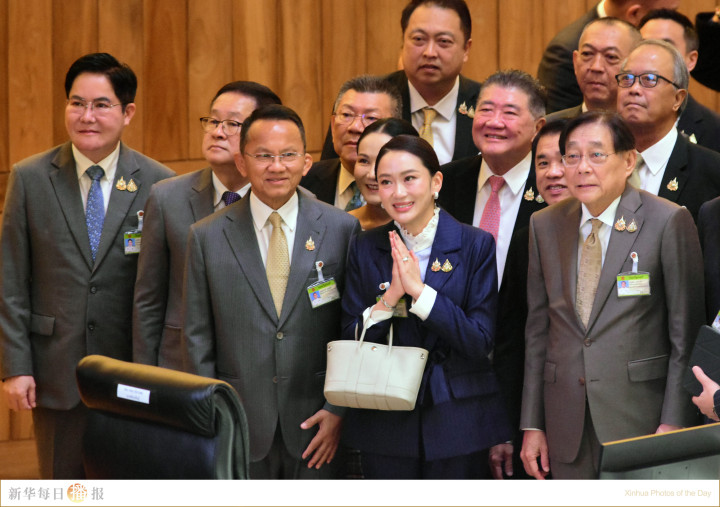 3月26日,在泰国曼谷,总理佩通坦(中)在不信任动议被否决后向人们致意。泰国国会下议院当日就针对总理佩通坦的不信任动议进行表决,最终该动议被否决。